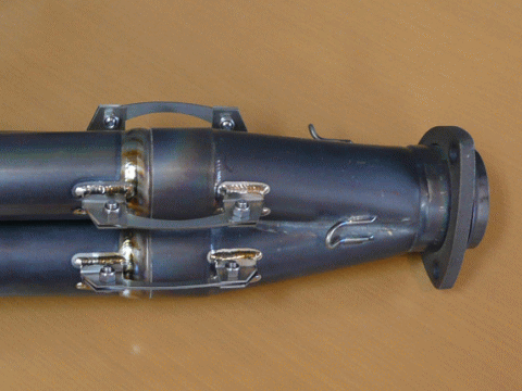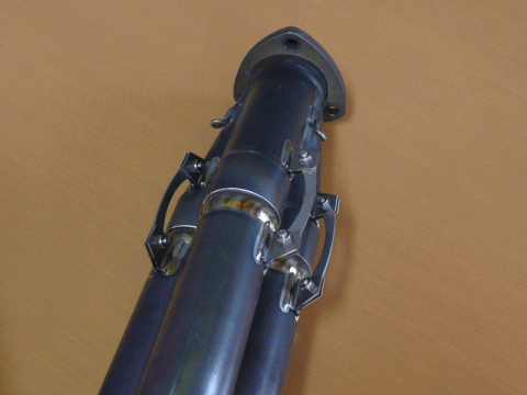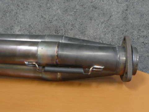 ビビリ音の原因だった集合部分だが、従来コイルスプリングにて固定されていたものを、特殊なステーを使った方法に変更した。