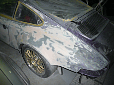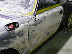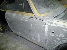 フェンダー後部からドア、リアフェンダーにかけて、全面にパテが入っている。