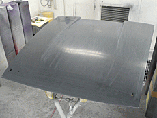 RSのフロントフードはアルミ製のため、剥離→アルミ用パテ→プライマー→サフェーサー→ペイント→クリアー仕上げとなる