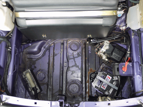 バッテリーはフロントトランク内の前方左側に装着されるが、この位置で約11Kgの軽量化となるため、デメリットよりもメリットの方が大きい。