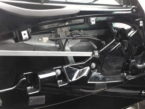 本来なら、上げる方のケーブルがレール上部のローラーを通してレギュレーターに取付けらているのだが、取付け部の樹脂が劣化して外れてしまった。